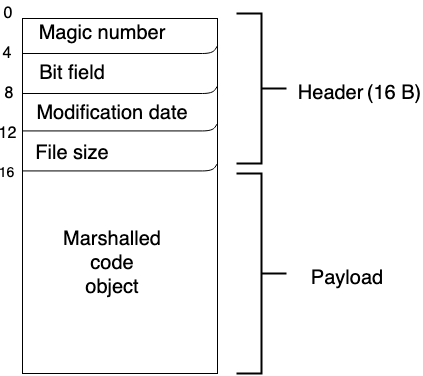 We can quickly refer to the guide by Siunam and the PEP-552 documentation to setup a small script that will craft a header and get the marshal dump of our malicious code. Here is structure for the header: