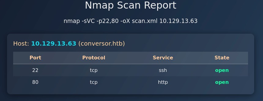 Service Info: Host: conversor.htb; OS: Linux; CPE: cpe:/o:linux:linux_kernel