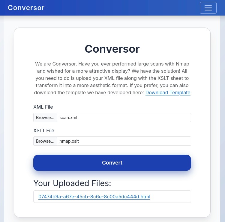 This website has a form that accepts two files: an nmap XML scan and a web template that feeds from that XML data using the format XSLT. It then converts both files into a HTML page served in the view/ directory.