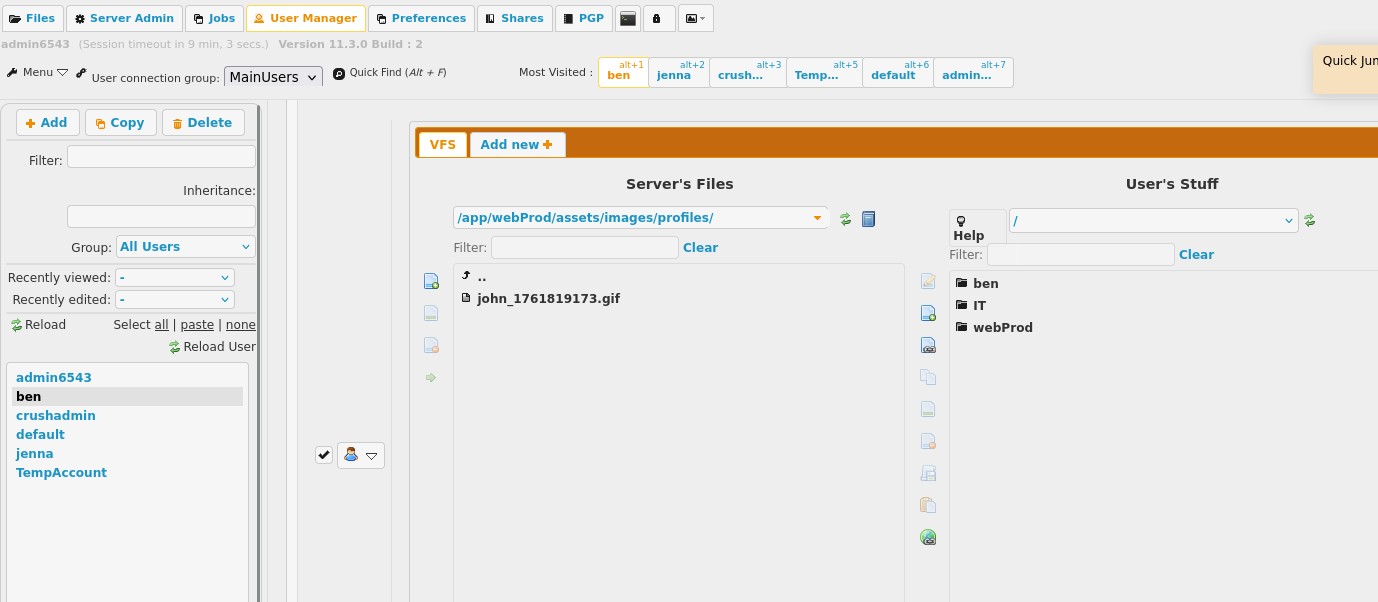 At the top we are able to change the passwords of users. We see that the user ben has the WebProd/ in his files, I changed his password and logged in, and it's very subtle but if you go inside either the WebProd/ or ben/ directories you are able to upload files, again the UI is very hard to understand.
